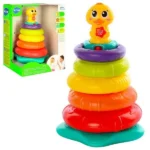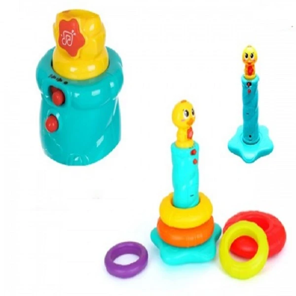 حلقه هوش رنگین کمانی اردک از 5 حلقه رنگی با رنگهای شاد و اندازه های متفاوت تشکیل شده که کودک را با رنگ ها و اندازه ها آشنا میکند و میتواند حلقه ها را به ترتیب اندازه بر روی هم قرار دهد. این اسباب بازی از پلاستیک نشکن و با کیفیت ABS تولید شده و برای کودکان کاملا ایمن است حلقه هوش رنگین کمانی اردک هولی تویز، یک اسباب بازی موزیکال است که از رنگهای شاد و متنوع در ساخت آن استفاده شده است. این اسباب بازی از مواد اولیه مرغوب نکشن تولید شده که باعث ماندگاری آن میشود. این اسباب بازی با پنج حلقه رنگی متنوع همراه است. حلقه هوش رنگین کمانی اردک هولی تویز، یک انتخاب صحیح برای آموزش و سرگرمی کودک میباشد. بازی کردن با این وسیله از منظرهای مختلف در رشد ذهنی و قوای جسمی کودک اثر گذار است به طوری که مهارت دستان کودک به واسطه بازی با حلقه ها، تقویت حس بینایی به دلیل استفاده از رنگهای مختلف، بهبود قدرت شنوایی به خاطر موزیکال بودن اسباب بازی افزایش خواهد یافت موزیکال بودن استفاده از رنگهای متنوع دارای 5 حلقه رنگی با ابغاد مختلف دارای کلید کنترل صدای استفاده از پلاستیک مرغوب و فاقد سرب مناسب برای بازی دختران و پسران دارای ابعاد مناسب طراحی جذاب دارای پایه برج و 5 حلقه هوش به رنگ های مختلف روی پایه کلید روشن / خاموش کردن قرار گرفته است کلید تنظم صدا دارد عروسک جوجه زیبای زرد رنگ روی برج قرار دارد روی بدنه جوجه چراغ چشمک زن تعبیه شده که هنگام پخش موزیک روشن می شود با فشردن جوجه به پایین موزیک پخش خواهد شد با هر بار قرار دادن حلقه روی برج موزیک جدیدی پخش می شود از پلاستیک مقاوم، با کیفیت ABS و نشکن تهیه شده است